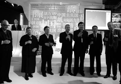 2009年10月17日,“中国知网”与大英百科全书出版集团、ProQuest公司在法兰克福书展举行签约仪式。上图从右至左分别为:剑桥大学出版社学术与专业图书部销售总监Ben Ashcroft、新闻出版总署副署长邬书林、“中国知网”总经理王明亮、大英百科全球授权执行总监Steven Gilberg、“中国知网”常务副总经理张振海、ProQuest全球合作总监Julie Carroll- Davis、香港大学图书馆馆长Anthony Ferguson博士。(国际合作部 杨海燕)